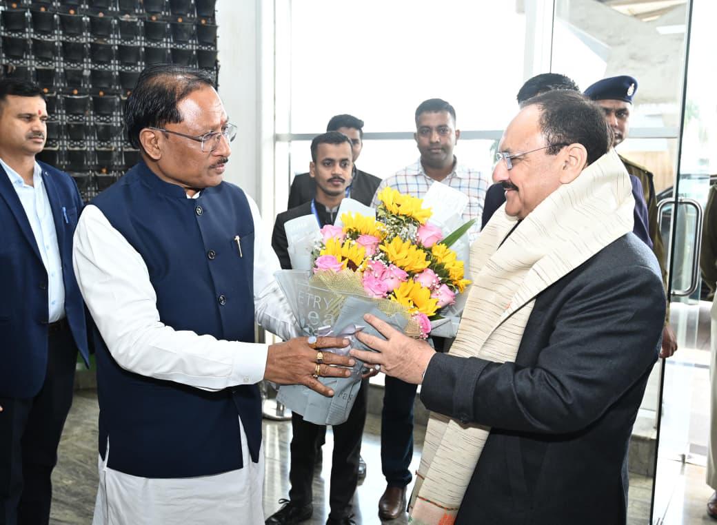 रायपुर/मुख्यमंत्री विष्णुदेव साय ने सोमवार को स्वामी विवेकानंद विमानतल, रायपुर में केंद्रीय स्वास्थ्य एवं परिवार कल्याण मंत्री जेपी नड्डा का आत्मीय स्वागत किया। इस अवसर पर मुख्यमंत्री ने पुष्पगुच्छ भेंट कर उनका अभिनंदन किया।